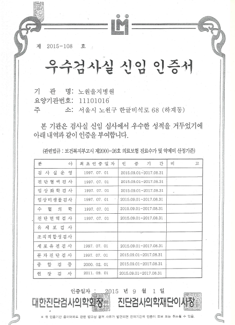 우수검사실 신임 인증서[15.9.1-17.8.31]